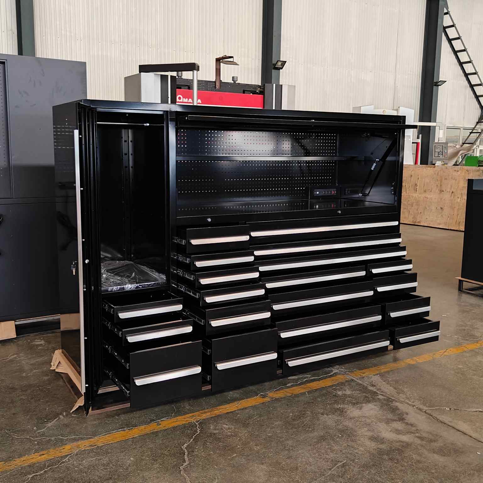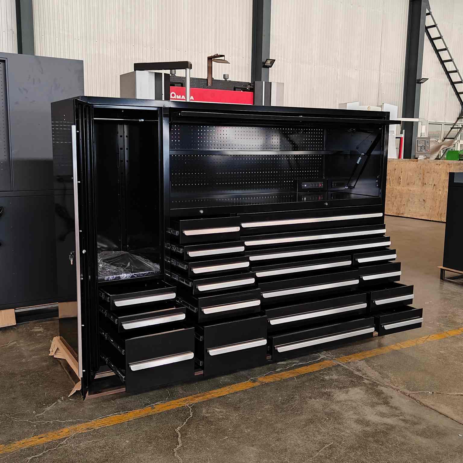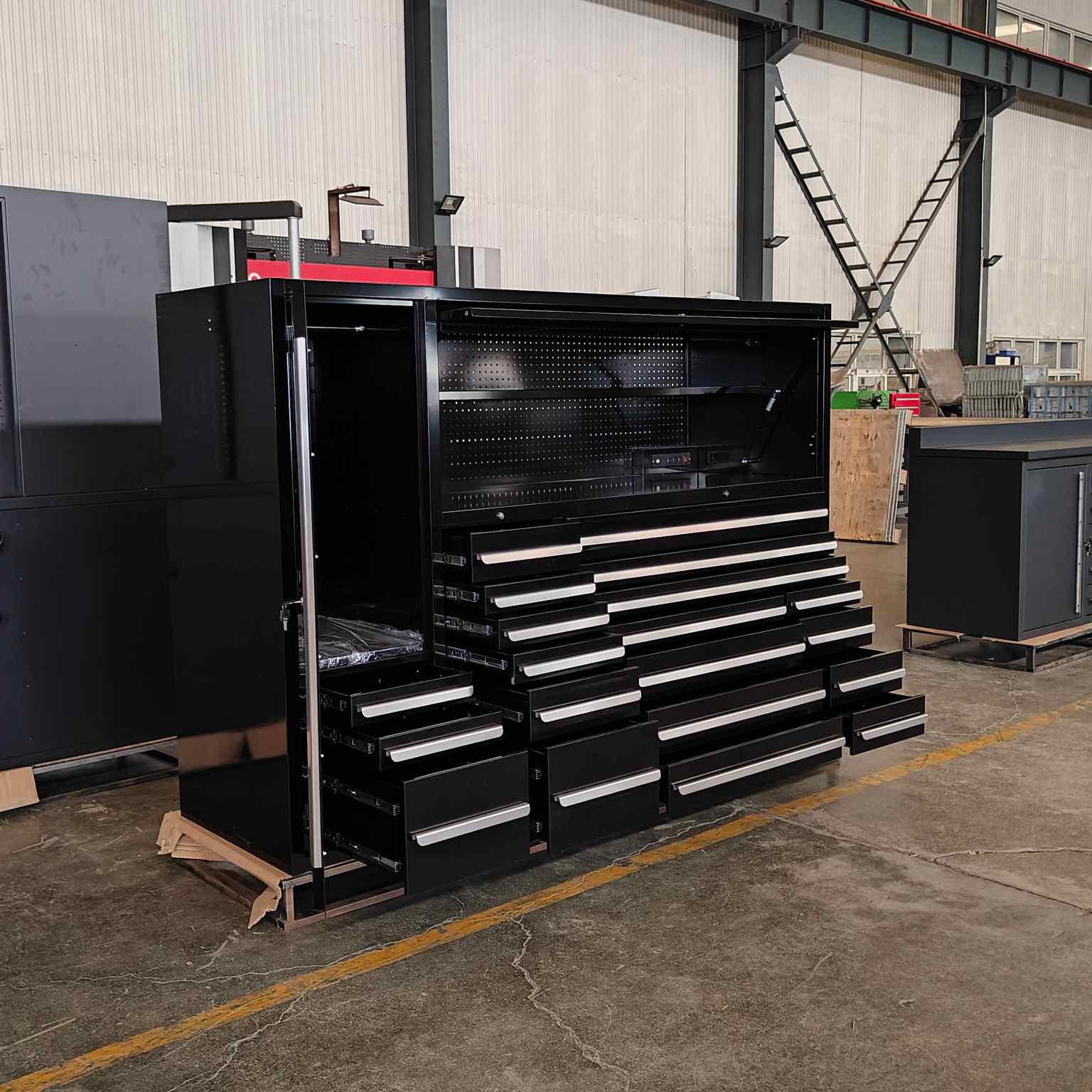 Cyjy musta multifunktsionaalset tööriistakappi saab kasutada garaaži tööruumides, kodudes ja remonditöökodades ning see on varustatud tööriistaraamide, toitekodade ja hoiusahtlitega. Cyjy must multifunktsionaalne tööriistakapp on pakkunud mugavust tehase töökoja jaoks.