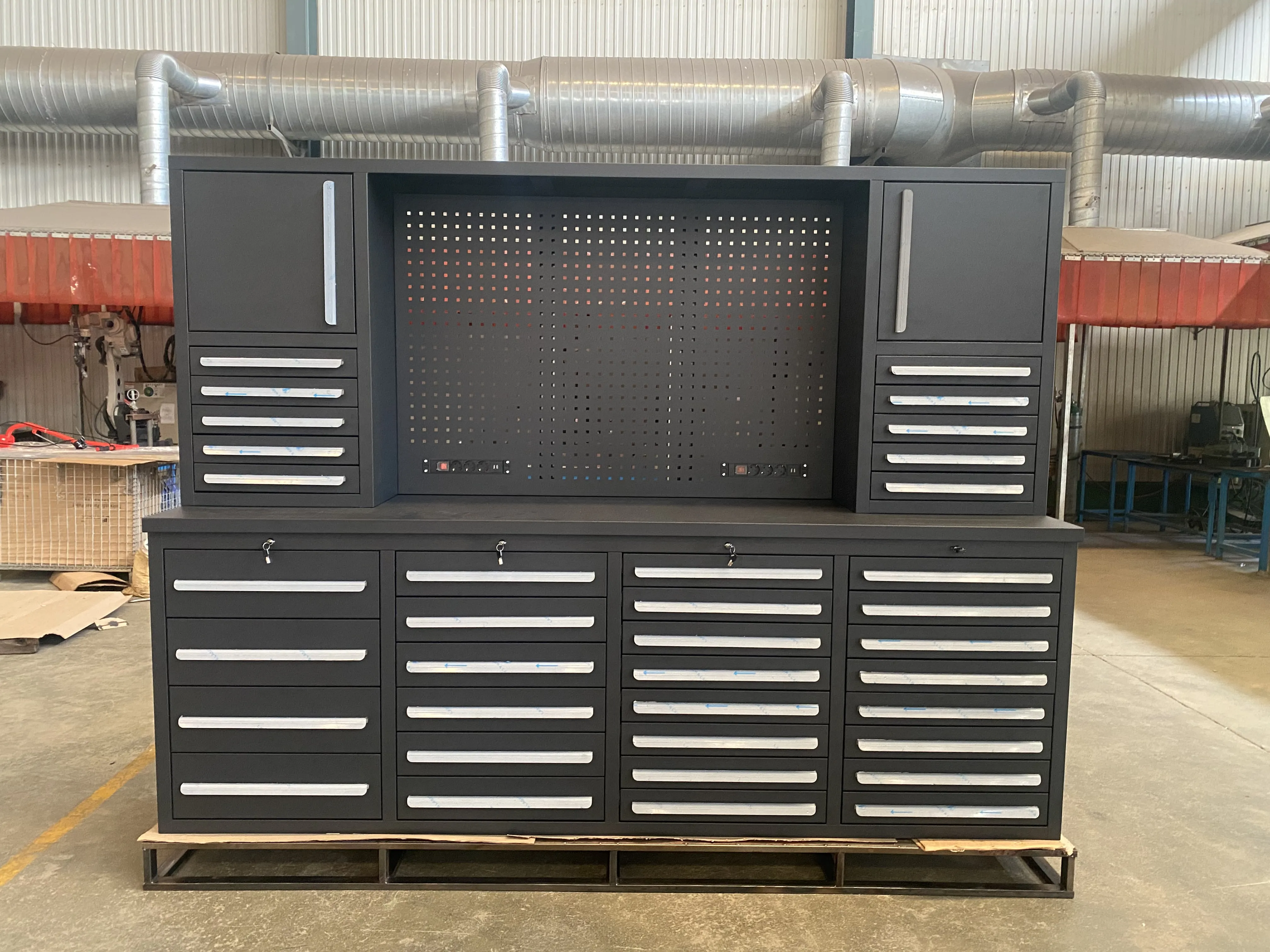 Need tööriistakapid on valmistatud kvaliteetsetest külmproolsilistest terasest taldrikutest, tagades tugevuse ja stabiilsuse. Sahtlid on meisterdatud tsingitud terasplaatidest, pakkudes suurepäraseid korrosioonivastaseid ja raskustevastaseid omadusi. Sees on 36 sahtlit, mis pakuvad piisavalt ruumi erineva suurusega tööriistade ja osade jaoks.